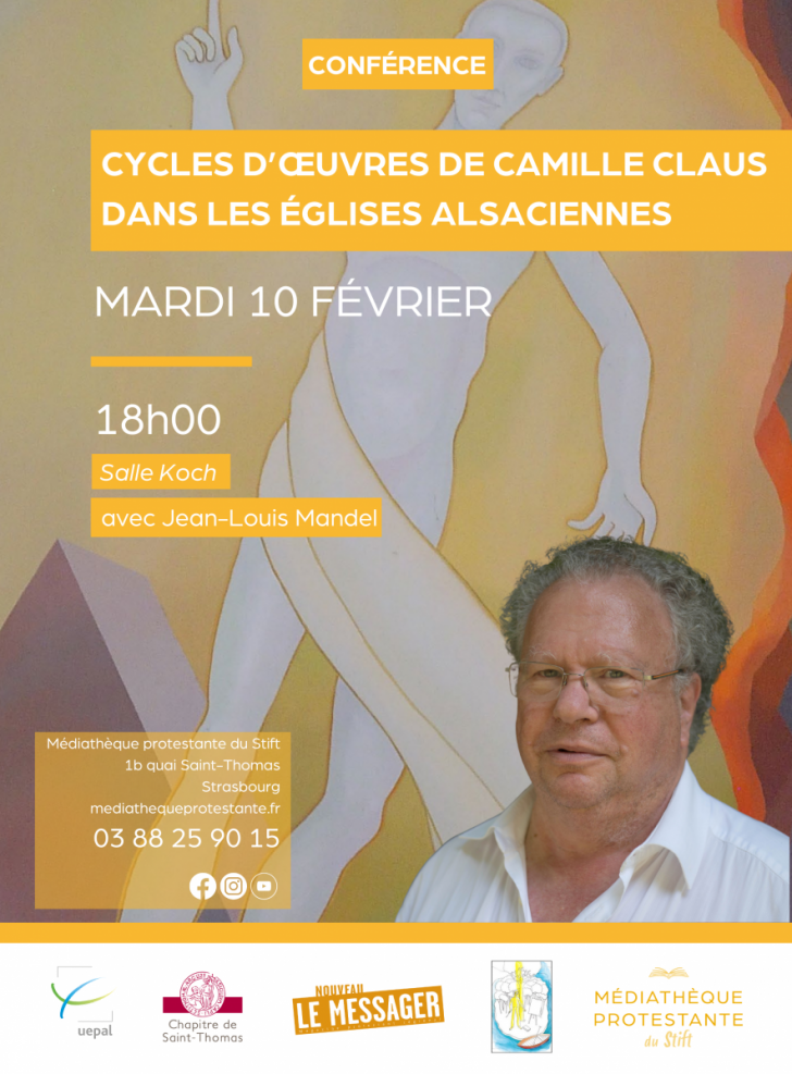Dans le cadre de l'exposition "Icônes de la présence", la médiathèque programme une seconde conférence consacrée à Camille Claus. Animée par Jean-Louis Mandel, grand spécialiste de l’œuvre du peintre alsacien, elle portera plus spécifiquement sur les cycles de toiles peintes par Camille Claus pour des églises, tant protestantes que catholiques, dans le Bas-Rhin.