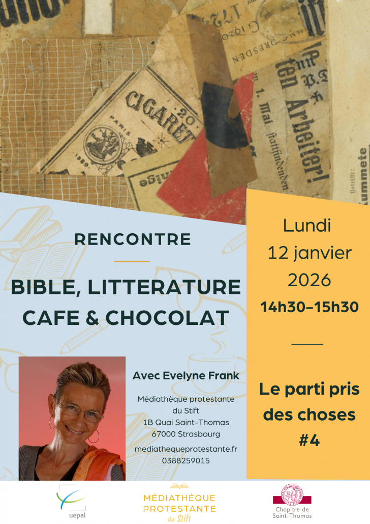 Lundi 12 janvier, 14h30 : Bible, littérature, café et chocolat. "Le parti pris des choses #4", avec Evelyne Frank