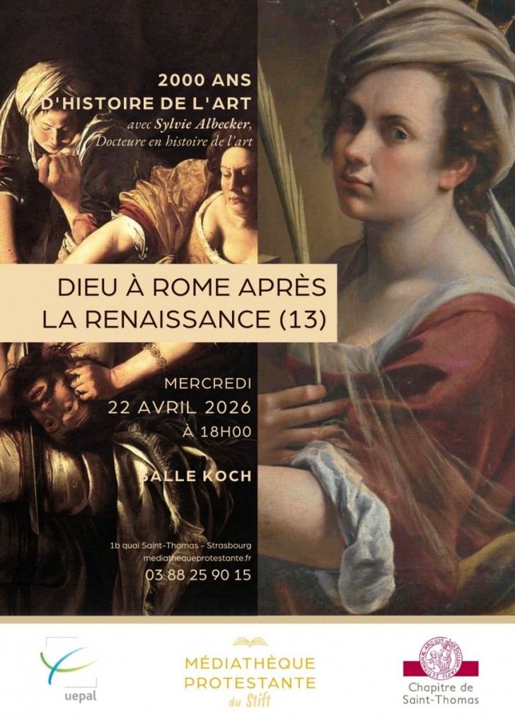 Le cycle "Dieu à Rome à la Renaissance" (et même après depuis 3 séances) touchera à sa fin le mercredi 22 avril. Sylvie Albecker présentera une figure majeure de la peinture du XVIIe siècle : Artemisia Gentileschi (1593-1654).